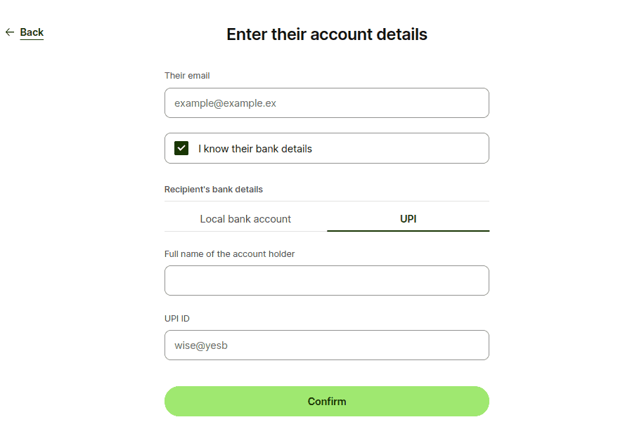 De stappen die je binnen je Wise account neemt om geld over te maken naar een UPI ID in India zijn: