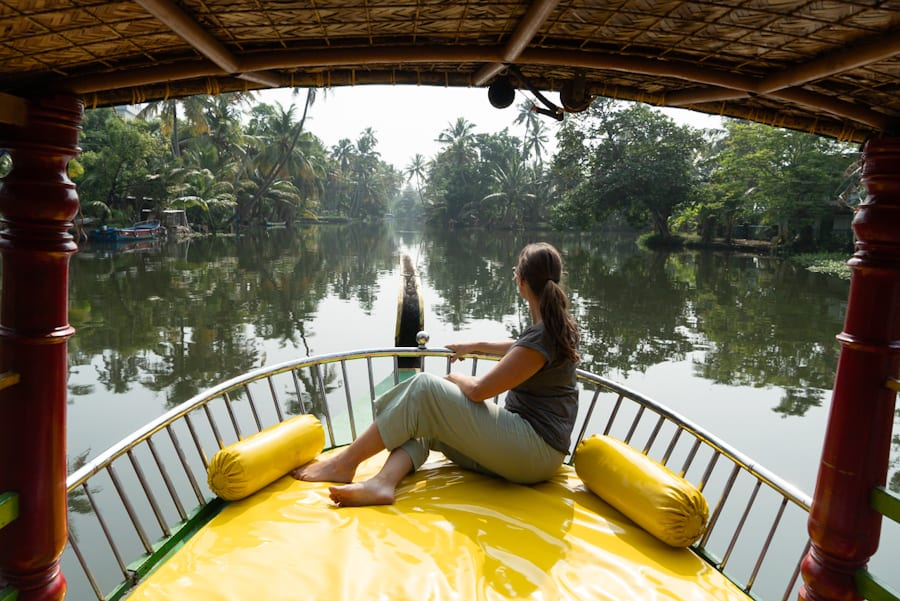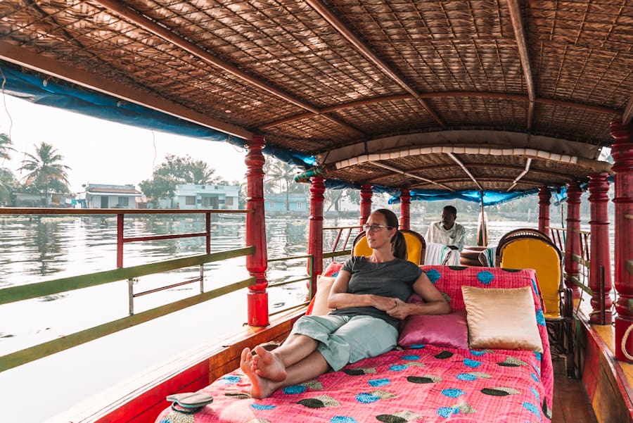 Naast onze dagen slijten op het strand maakten we ook nog een uitstapje naar de backwaters van Alleppey. Omdat dit misschien wel de meest populaire backwaters van Kerala zijn, was ik een beetje bang voor de drukte, maar het viel ons 100% mee. Ja, uiteraard was het er drukker dan in Nileshwar waar helemaal geen andere toeristen waren, maar in Alleppey boekten we tegen een spotprijs de meest relaxte boot ooit. Een ontzettend fijne ervaring.