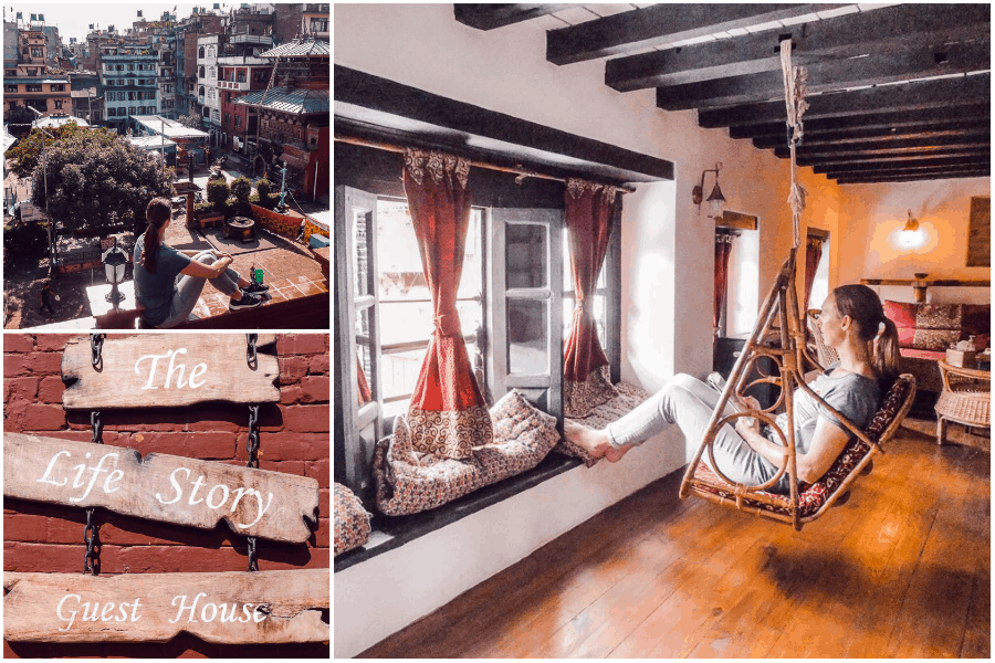 Wij verblijven in Patan in een ontzettend leuk en sfeervol hotel, The Life Story Guest House. Dit hotel bevindt zich op 5 minuten lopen van Patan Durbar Square en is rustig gelegen aan een mooi plein met een prachtige tempel. Het is een ontzettend mooi, authentiek Newari huis. Klein nadeel is dat de plafonds er heel erg laag zijn, maar gelukkig net hoog genoeg voor ons om te kunnen staan.