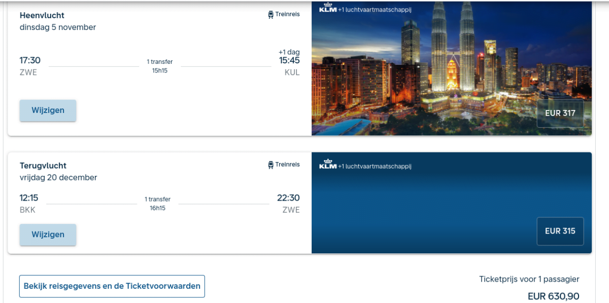 Tijdens het schrijven van dit artikel stuitte ik op een deal van KLM die ik zelf niet kon weerstaan en die ik hier nog even wil delen. Je kunt in november/december 2024 heel goedkoop met KLM naar o.a Thailand en Maleisië vliegen door een multi-city ticket te boeken vanaf Antwerpen, België. Je start je reis dus niet vanaf Schiphol, maar op het mooiste treinstation van de Benelux, het treinstation van Antwerpen. Vanuit hier reis je met de trein naar Schiphol en daar stap je over op een rechtstreekse vlucht naar zuidoost-Azië, waaronder Kuala Lumpur, Bangkok of Singapore. Je kunt dus heel makkelijk een trip naar Thailand combineren met een (steden)trip Kuala Lumpur of Singapore.